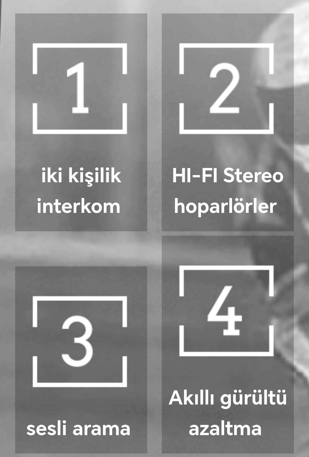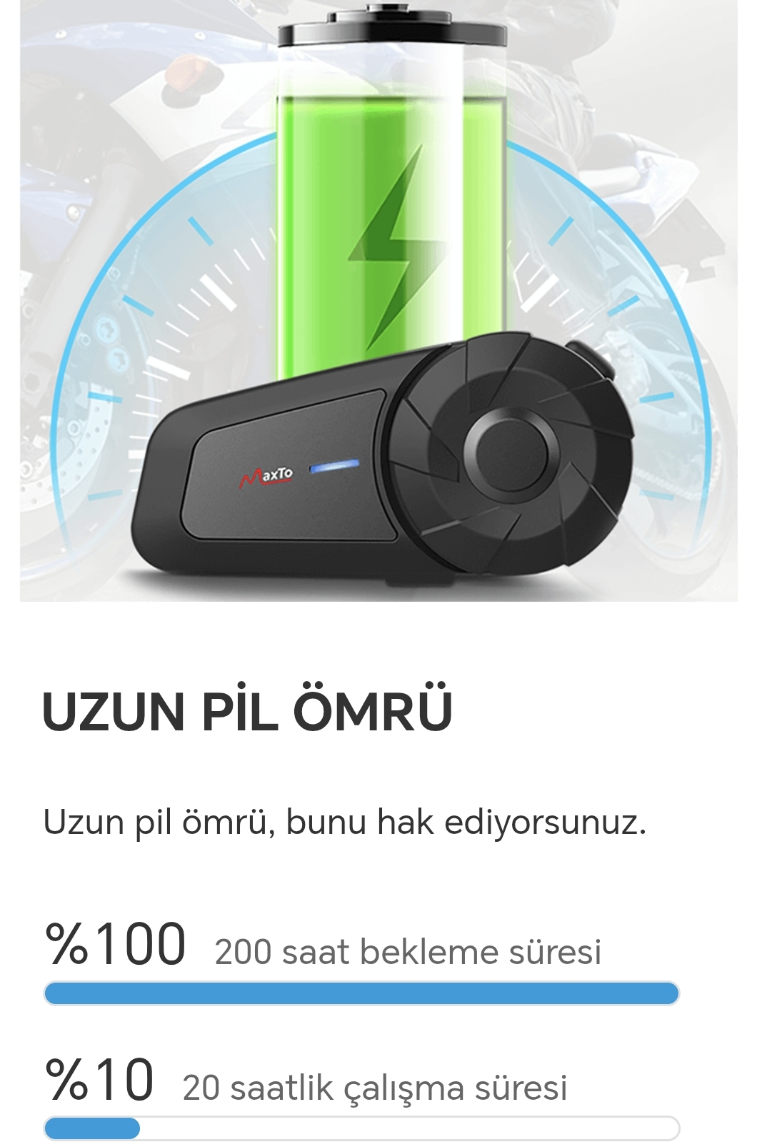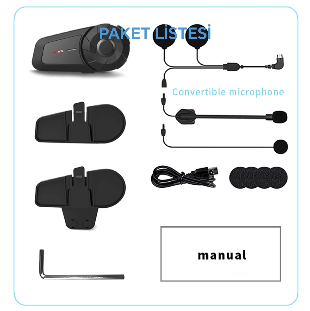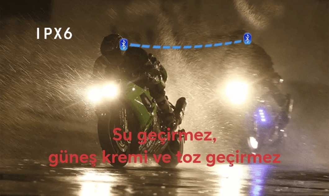 2 kişilik İnterkom Diğer Bluetooth kulaklığa bağlanma 800 metre çalışma menzili 2 cep telefonuna bağlanma A2DP stereo müzik Sesli Arama Sesli komut Şarj sırasında kullanılabilir Oynatma Kontrolü IP67 ve Yeni Nesil Type-C Şarj Gelişmiş gürültü kontrollü Bluetooth Bekleme süresi 200 Saat Bluetooth Konuşma ve Müzik Dinleme süresi 20 saat Türkçe Kullanma Kılavuzu (Türkçe Dil Desteği Çok Yakında ) 3 Yıl Garanti ve Servis yedek parça hizmeti