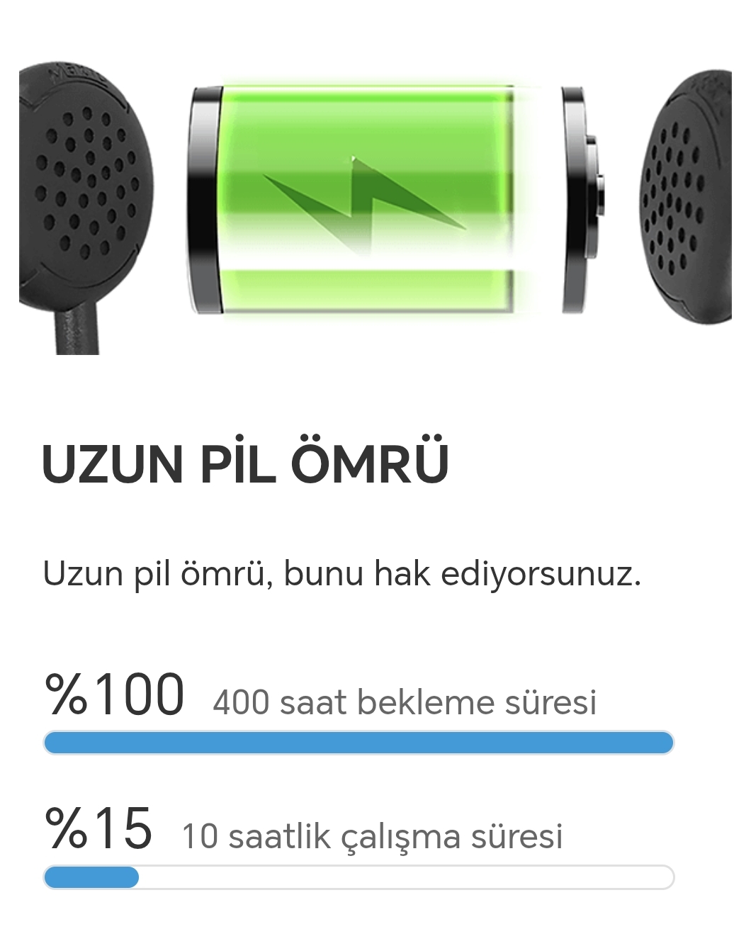 Süper ses kalitesi, yüksek ses seviyesi İki cep telefonunu bağlayabilme 10 Metre Çalışma menzili Cep telefonunuzu bağlayarak aramaları cevaplayabilir, reddedebilir, sesli arama yapabilir ve müzik çalabilirsiniz. İşlev Önceliği: Telefon > Müzik Bluetooth Bekleme süresi 200 Saat Bluetooth Konuşma ve Müzik Dinleme süresi 10 saat Türkçe Kullanma Kılavuzu (Türkçe Dil Desteği Çok Yakında ) 3 Yıl Garanti ve Servis yedek parça hizmeti